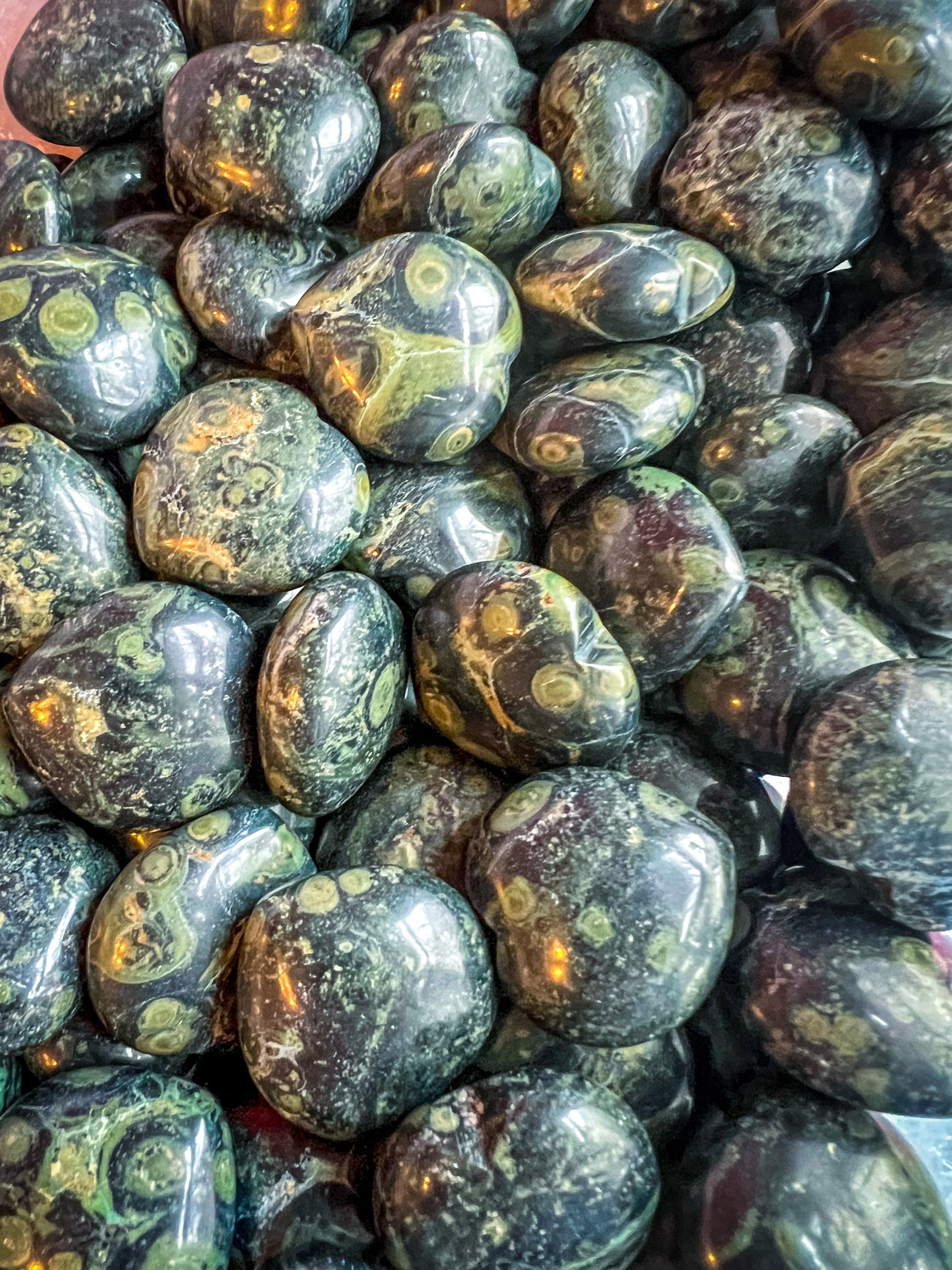 Kambaba Jasper, also known as Crocodile Jasper, is no ordinary stone. It's like the Earth decided to doodle on a canvas, creating patterns of deep green swirls and orbs set against a mysterious, black background. Each heart is a mesmerizing snapshot of our planet's history, a fossilized dance of algae and sediment from billions of years ago.