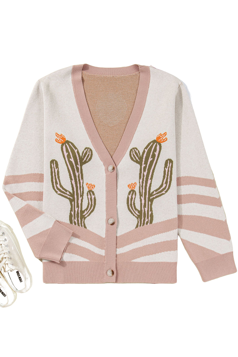 Apricot Cactus Print V Neck Plus Size Button Cardigan