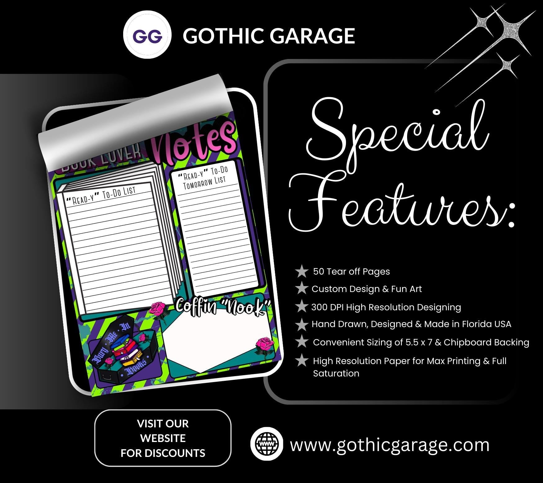 Calling all goth-lit lovers, spooky bibliophiles, and organization-obsessed readers—this book-themed tear-off notepad is your new obsession. With punny headers and creepy-cute coffin art, it’s perfect for keeping your “Read-y” life in check!