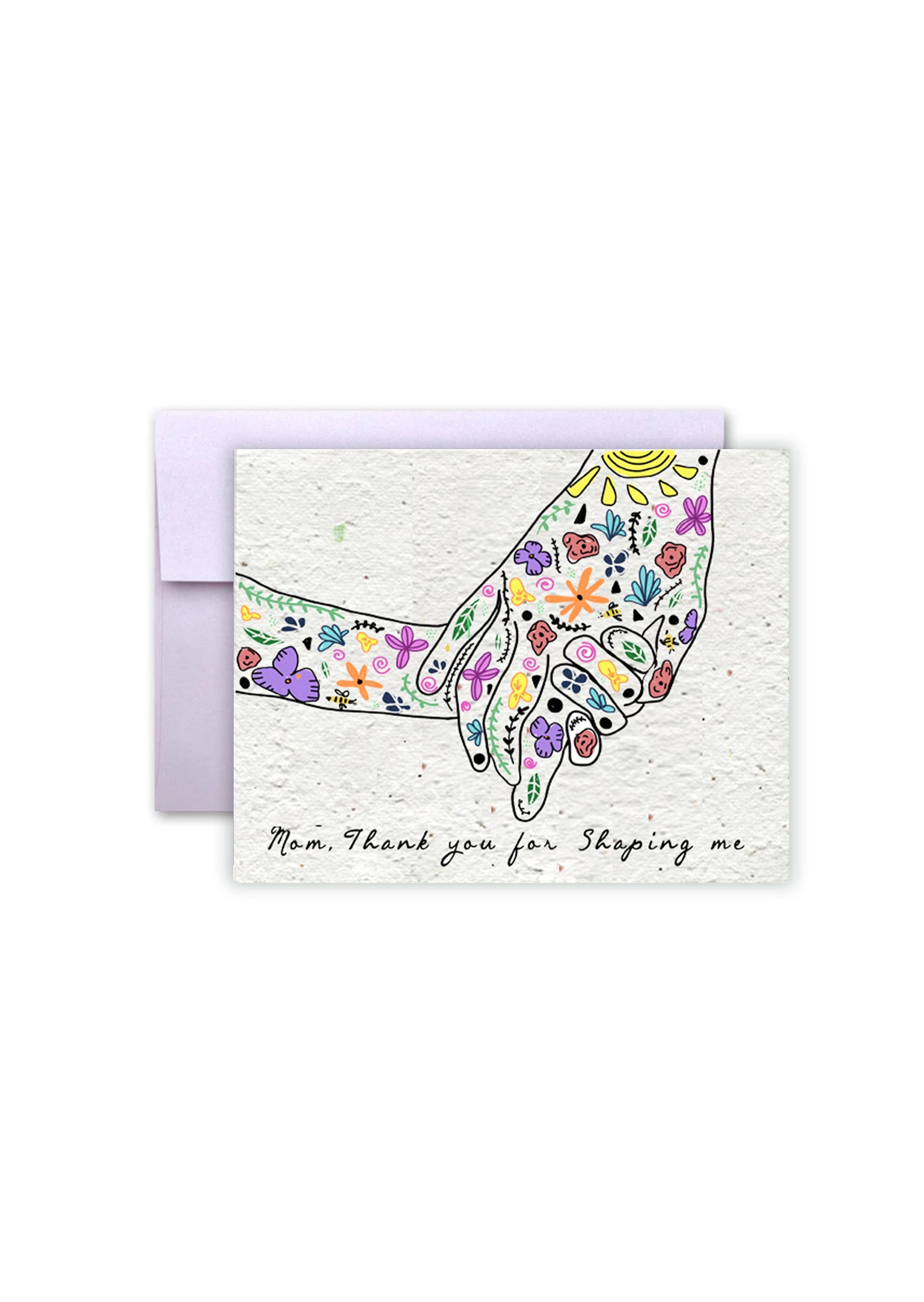 Celebrate Mother's Day in a unique and eco-friendly way with our charming Wildflower Seed Paper Card. This beautifully crafted card features an endearing design of two hands tenderly holding each other, adorned with delicate blossoms. The heartfelt message, "Mom, thank you for shaping me," elegantly expresses gratitude and appreciation for the nurturing influence of mothers.