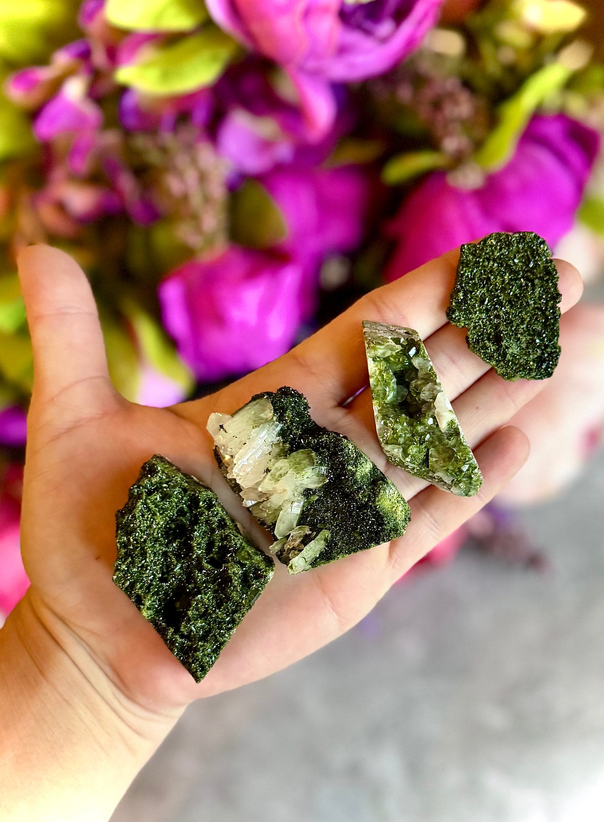 Whether displayed as a striking decor piece or cherished as a tool for spiritual connection, these Forest Epidote Specimens are treasures that invite the calming whispers of nature into your world.
