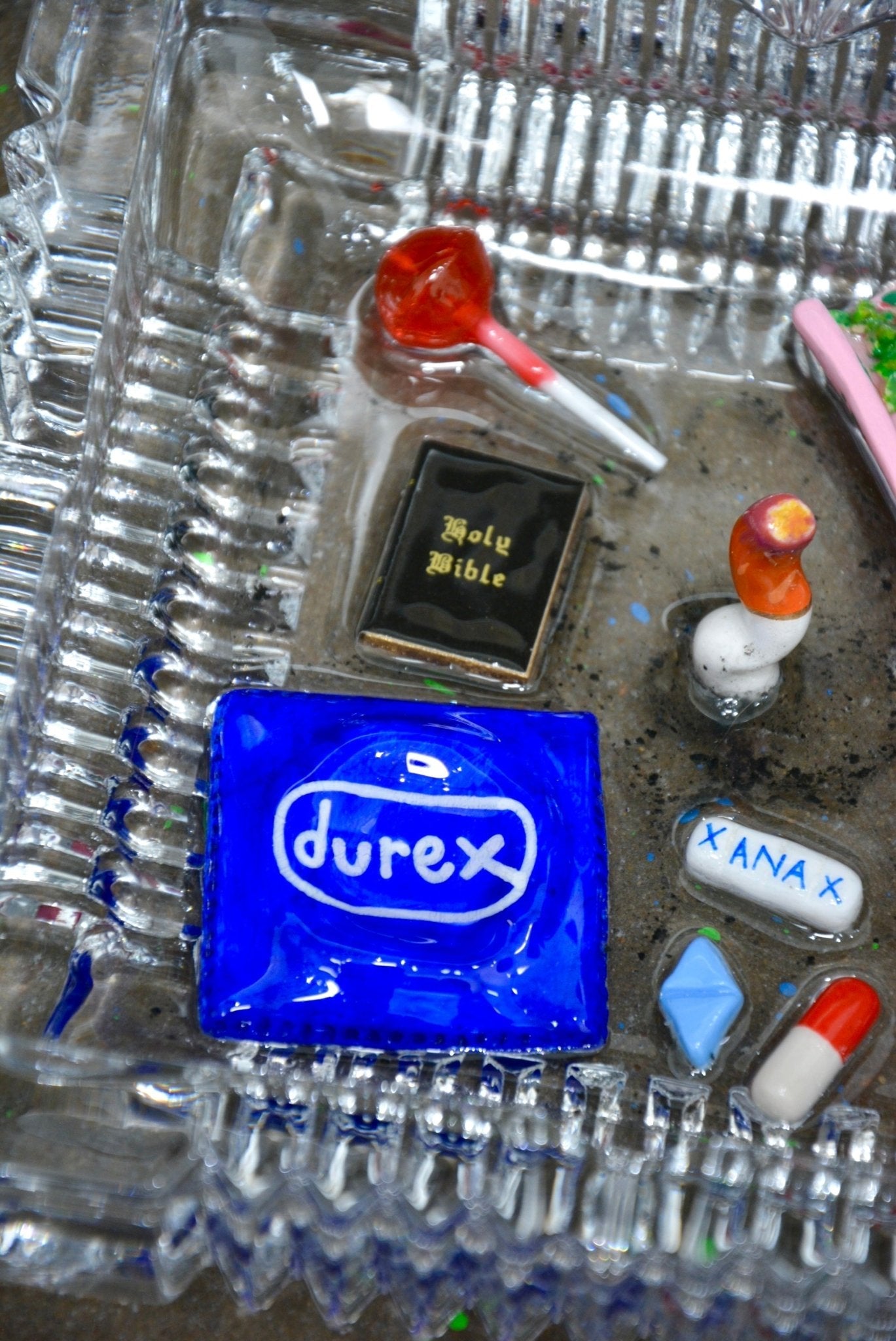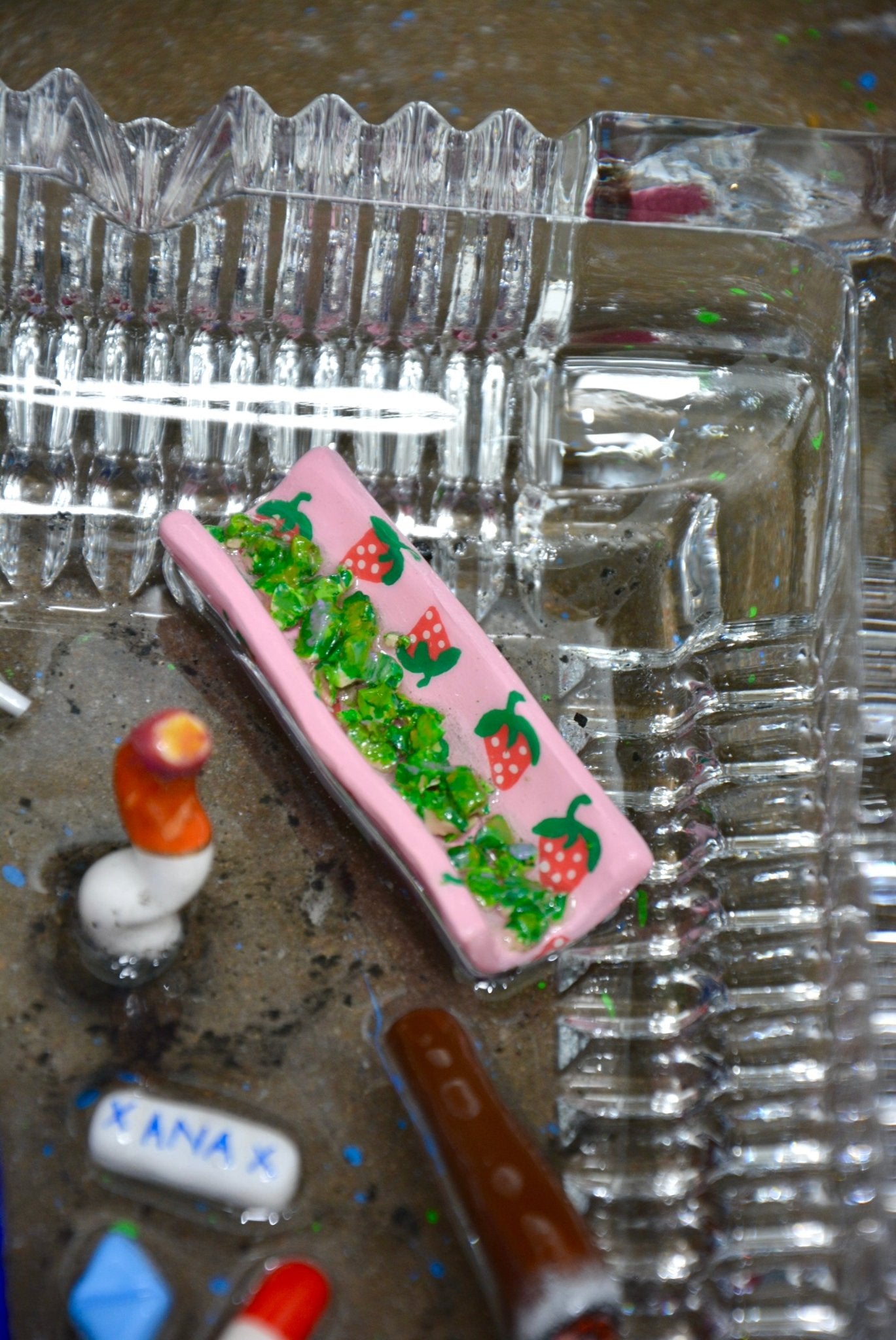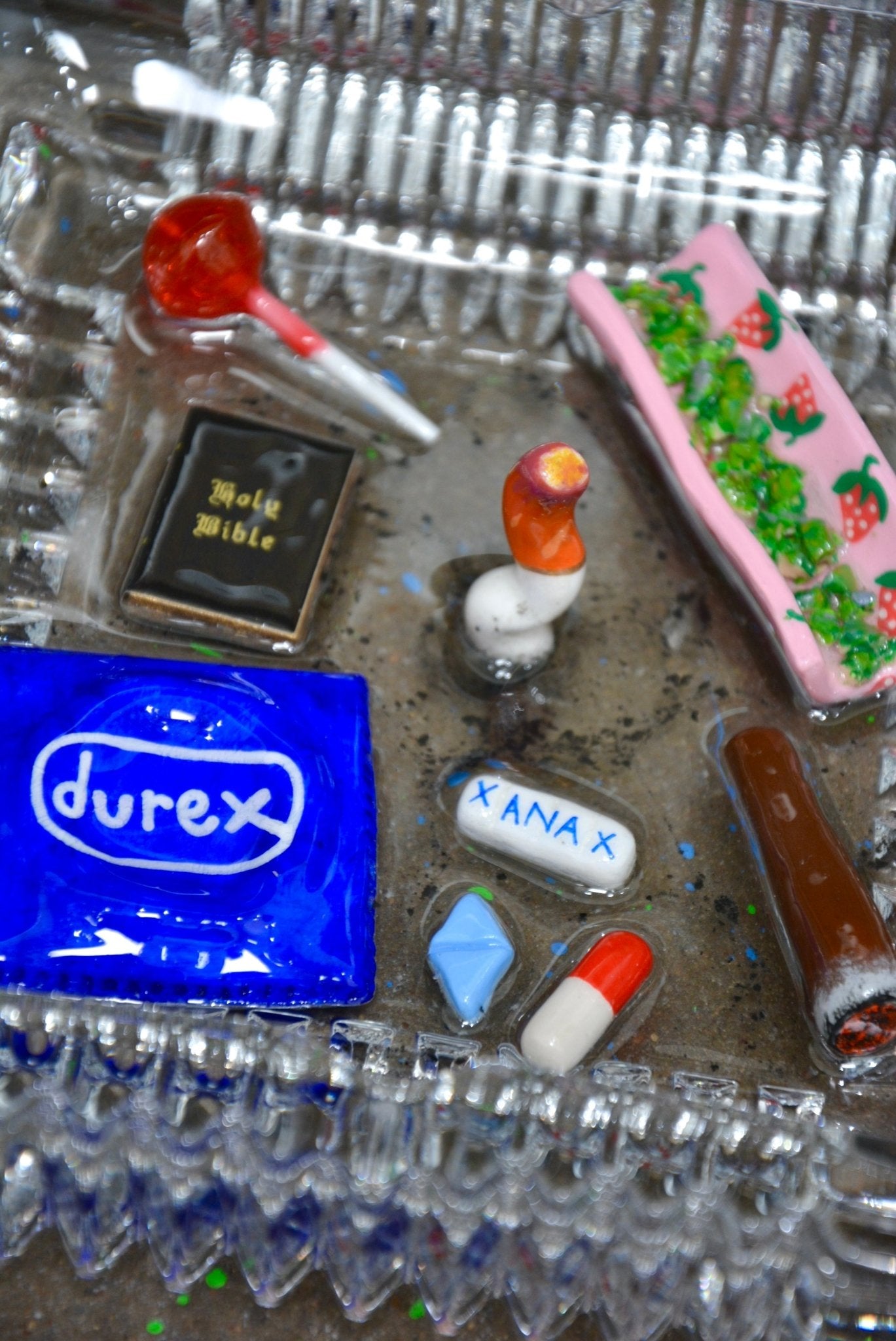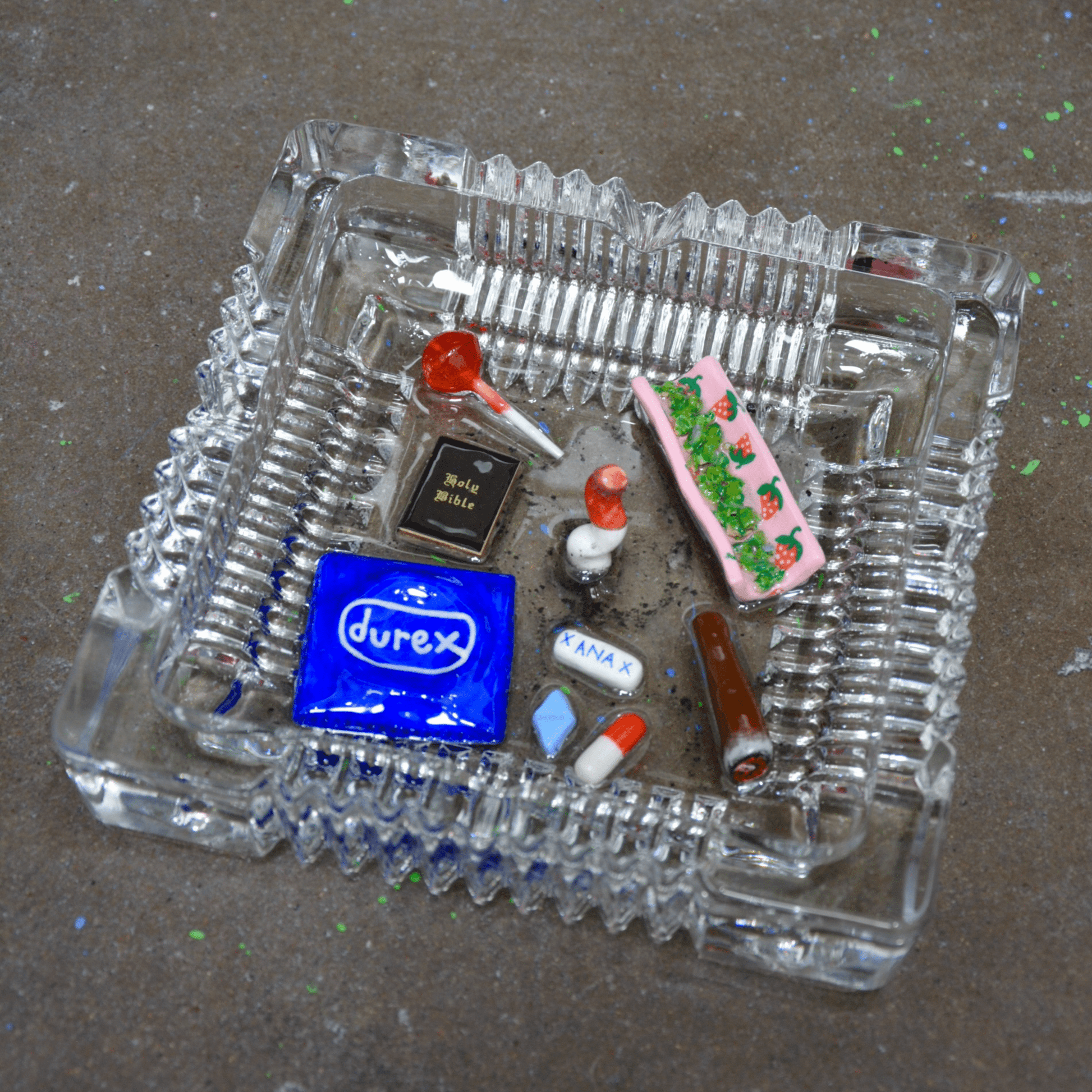 The Forgive Me Father, For I Have Sinned Ashtray playfully contrasts the sacred and the scandalous, challenging us to embrace our vices and celebrate the duality of human nature. Featuring a condom, a “lit” blunt, pills, a “melty” lollipop, a bible, crinkled cigarette butt, and a strawberry joint, this ashtray is the ultimate conversation piece.