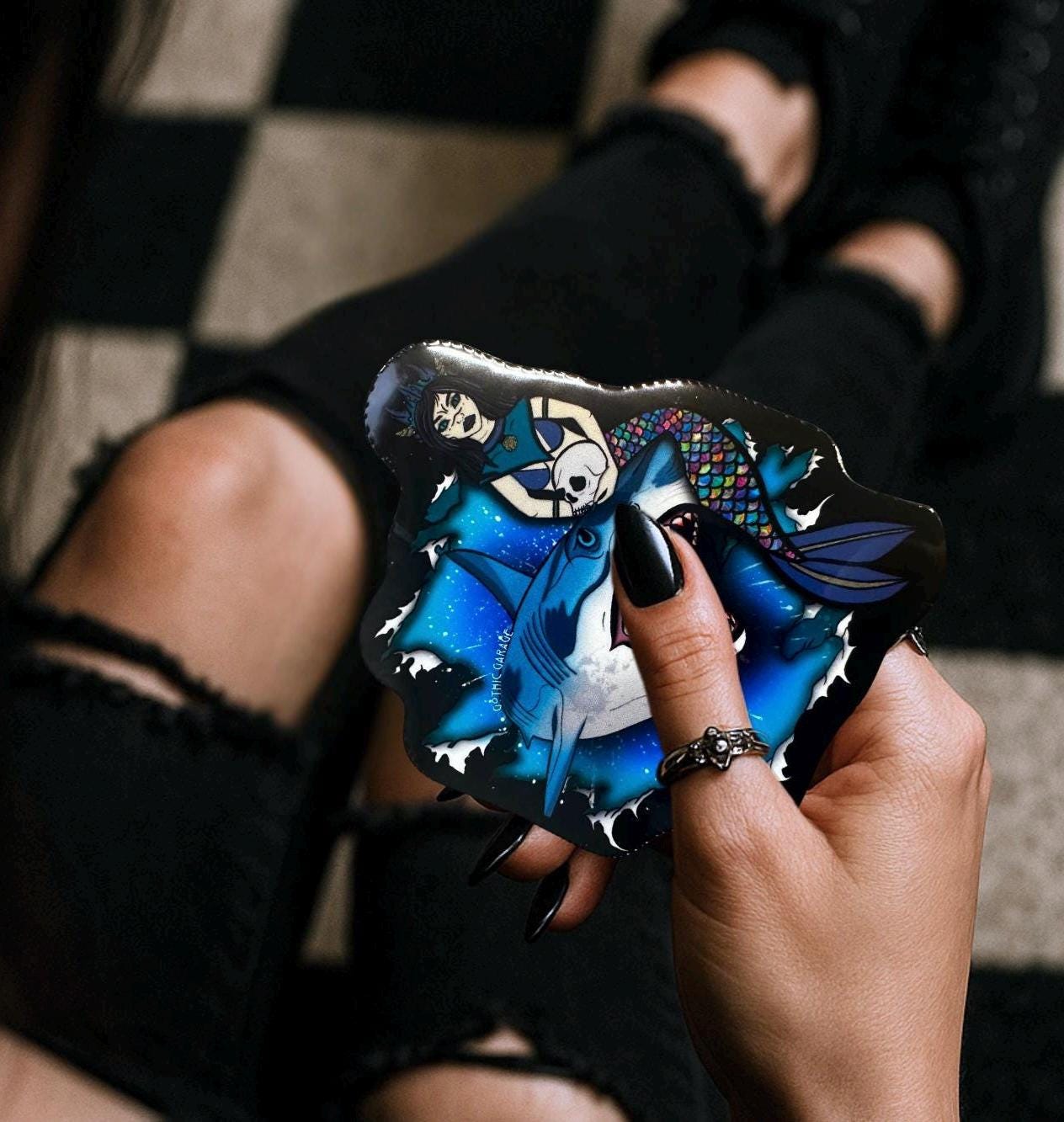 Dive into the dark depths of gothic ocean horror with this bone-chilling sticker featuring a sinister siren and a blood-curdling shark. The dark siren, draped in gothic beauty, clutches a human skull while leaning upon a monstrous shark bursting from the ocean’s surface. The eerie combination of the feral sea predator and the haunting sea witch captures the perfect blend of macabre ocean beauty and deadly terror.