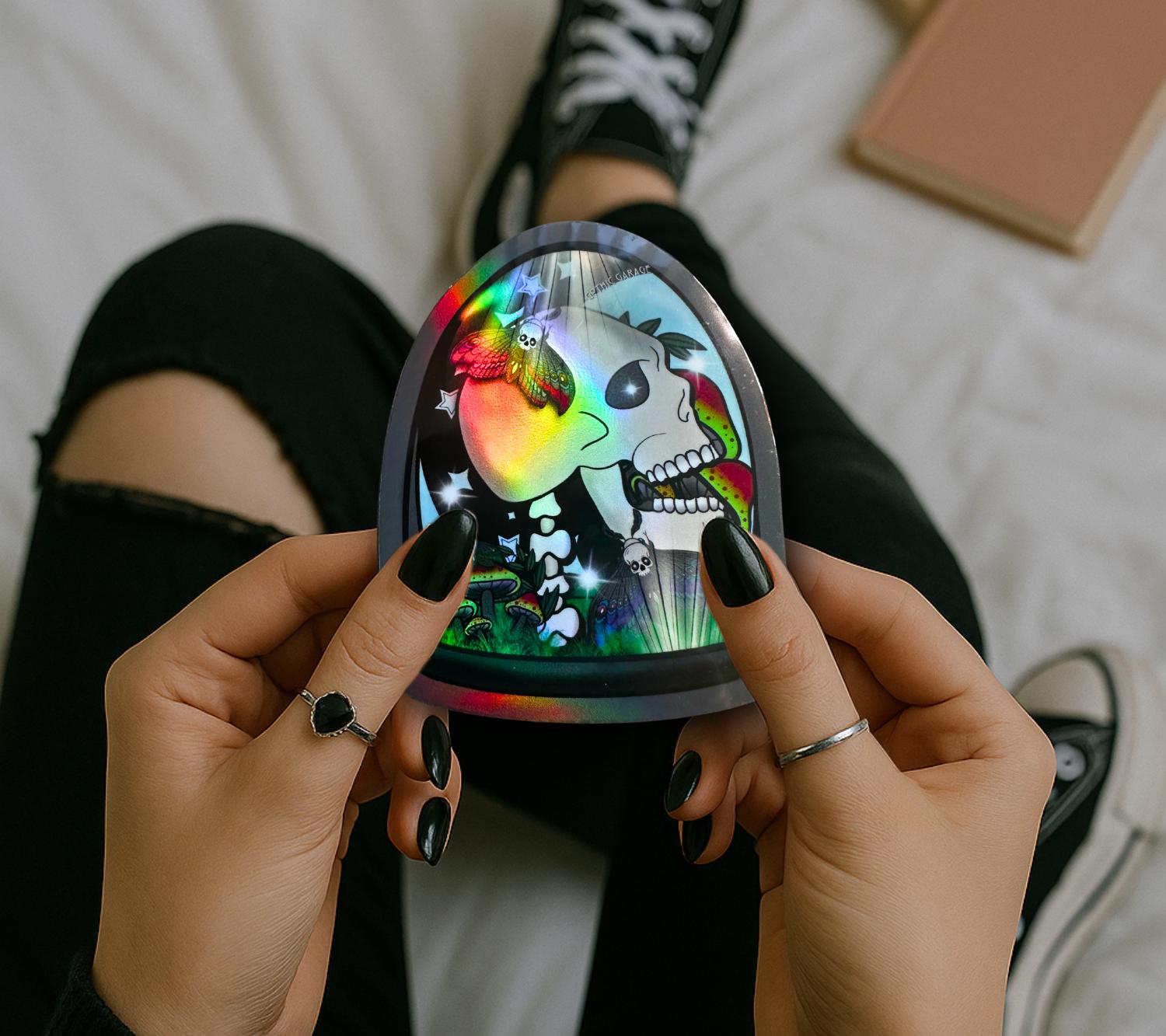 Gothic Skull Terrarium Sticker: Waterproof Oddities Art, Glossy or Holographic