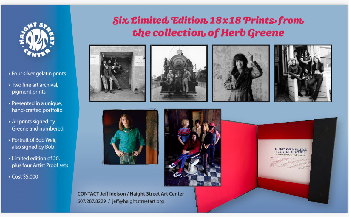 Four silver gelatin prints • Two fine art archival, pigment prints • Presented in a unique, hand-crafted portfolio • All prints signed by Greene and numbered • Portrait of Bob Weir, also signed by Bob • Limited edition of 20, plus four Artist Proof sets •