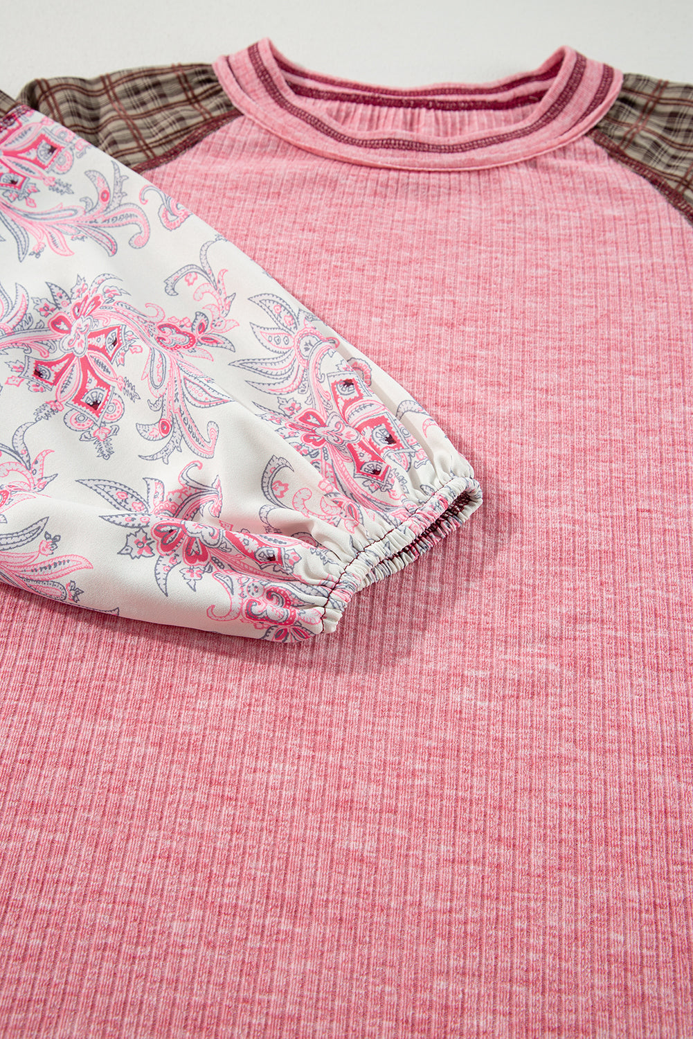 Jet Stream Floral Plaid Mixed Print Patchwork Raglan Ribbed Top