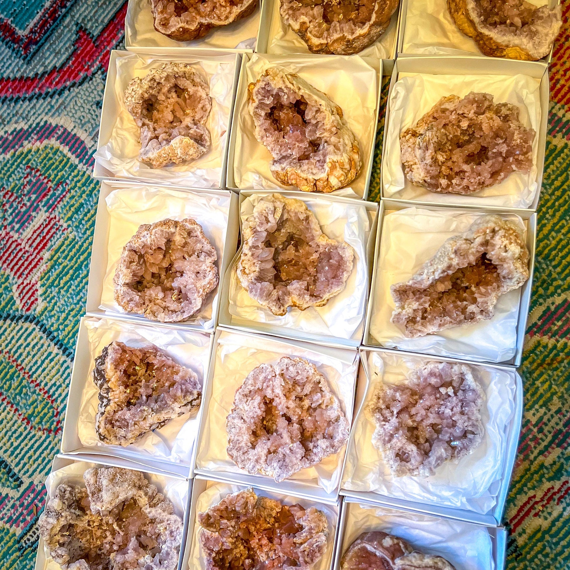 Discover the allure of our large raw pink amethyst geodes, a recent gemstone find cherished for its delicate blush tones and distinct crystalline composition. The soft, calming shades ranging from light pink to deeper peachy-pink evoke the essence of an impressionist masterpiece, each piece a unique creation born from the depths of the Earth.