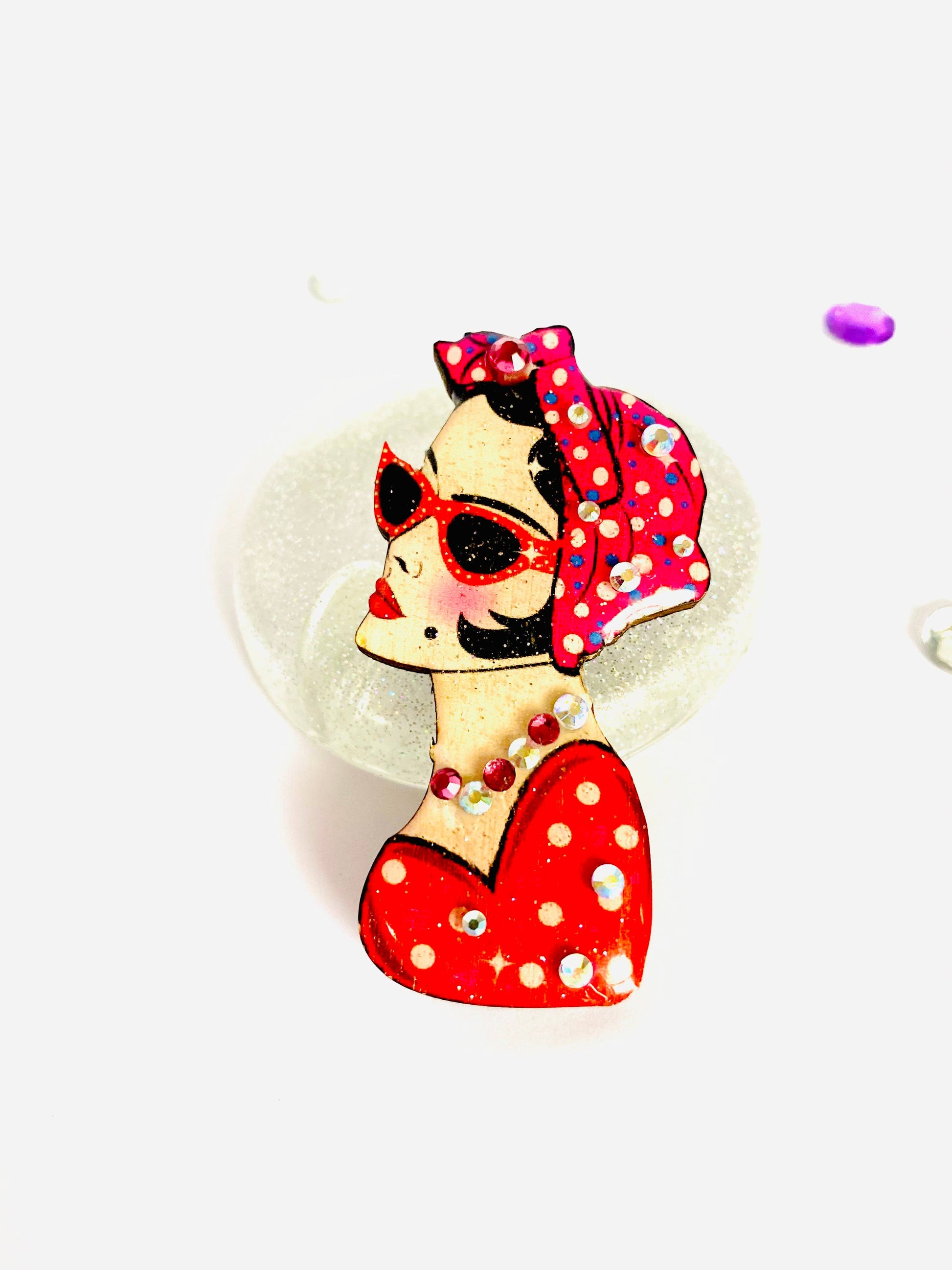 Be a trendsetter with this Mid-Century Lady in Turban Brooch by Rosie Rose Parker. This quirky brooch features a stylish lady wearing 1950s sunglasses, adding a vintage touch to any outfit. Stand out and make a statement with this playful and unique accessory!