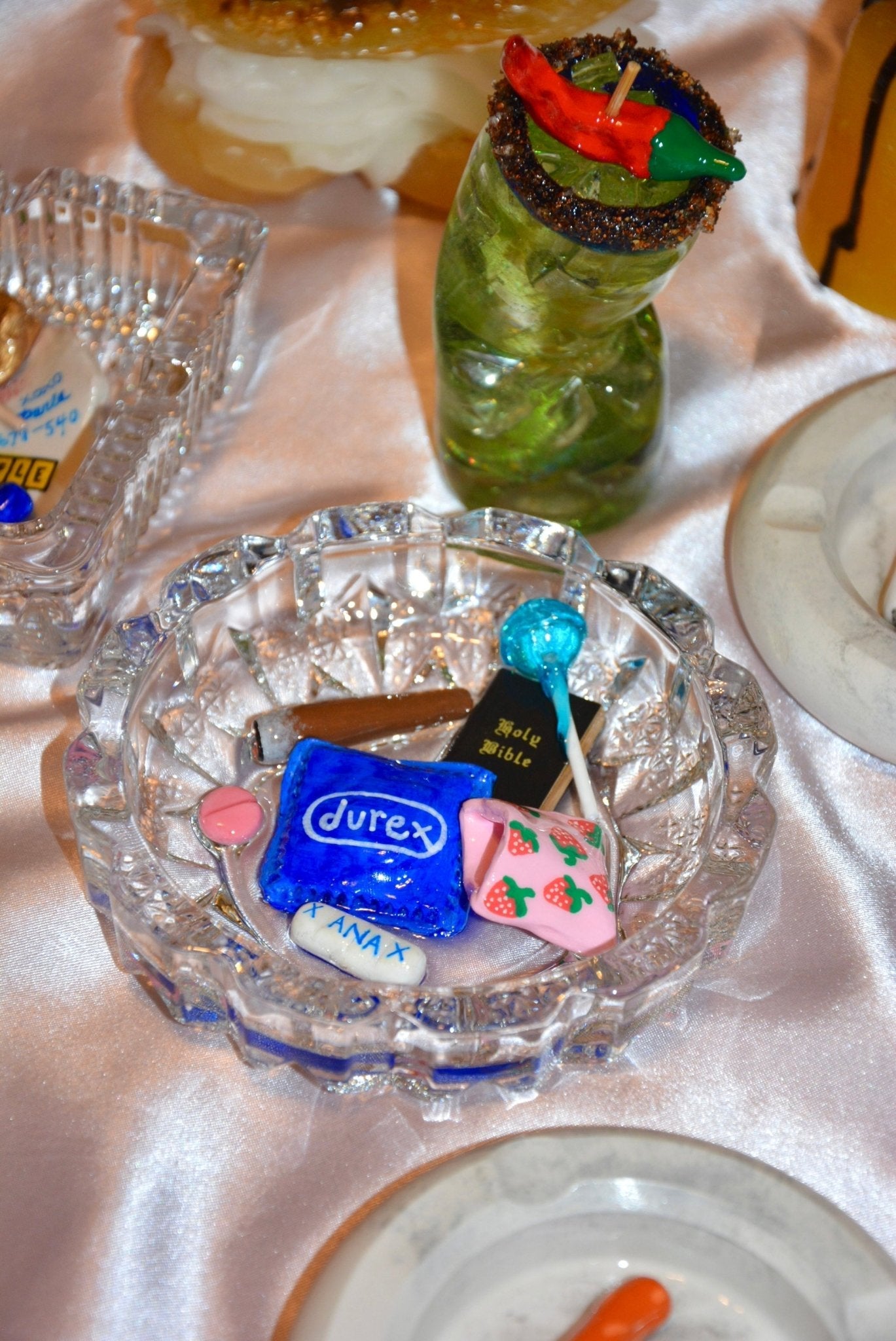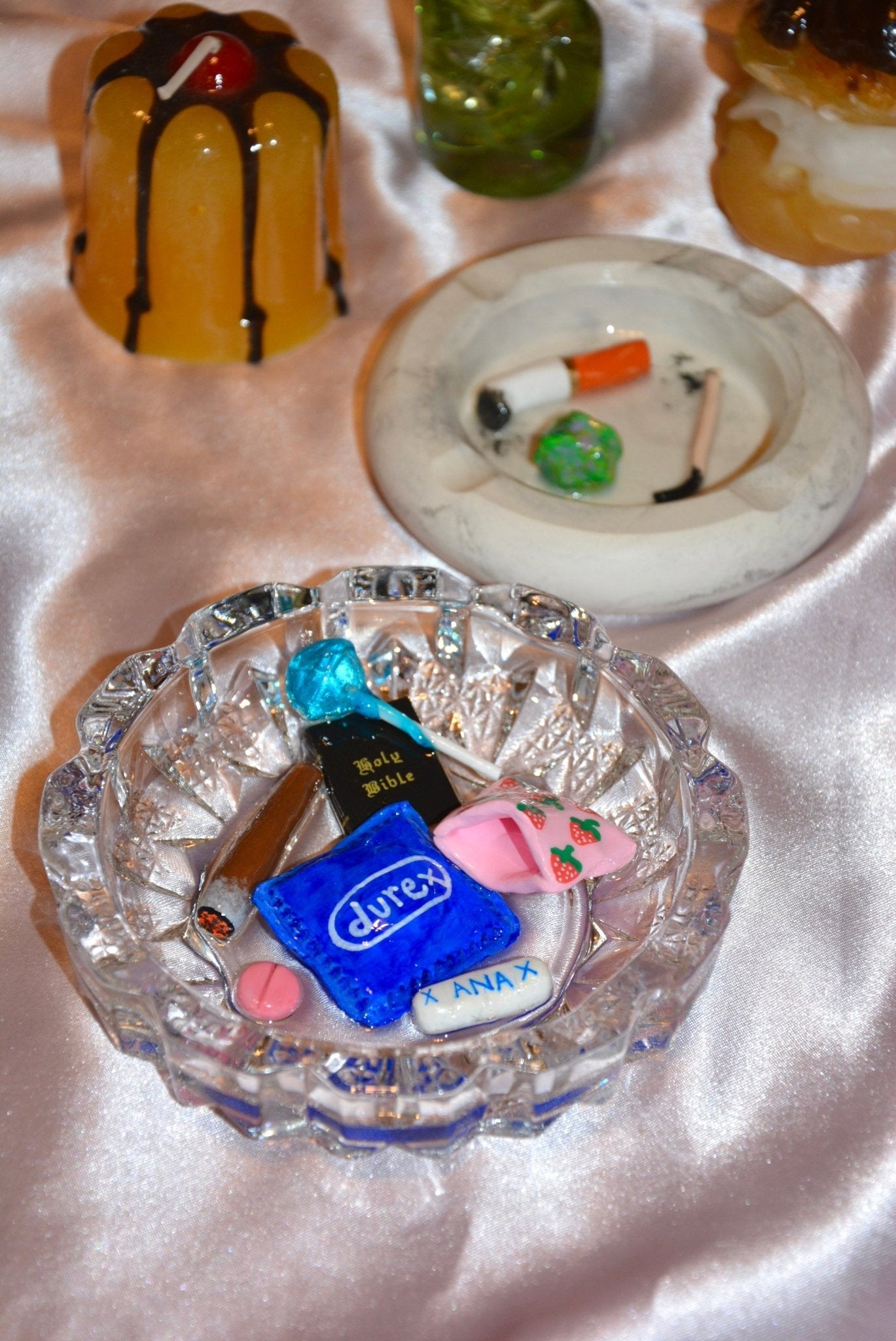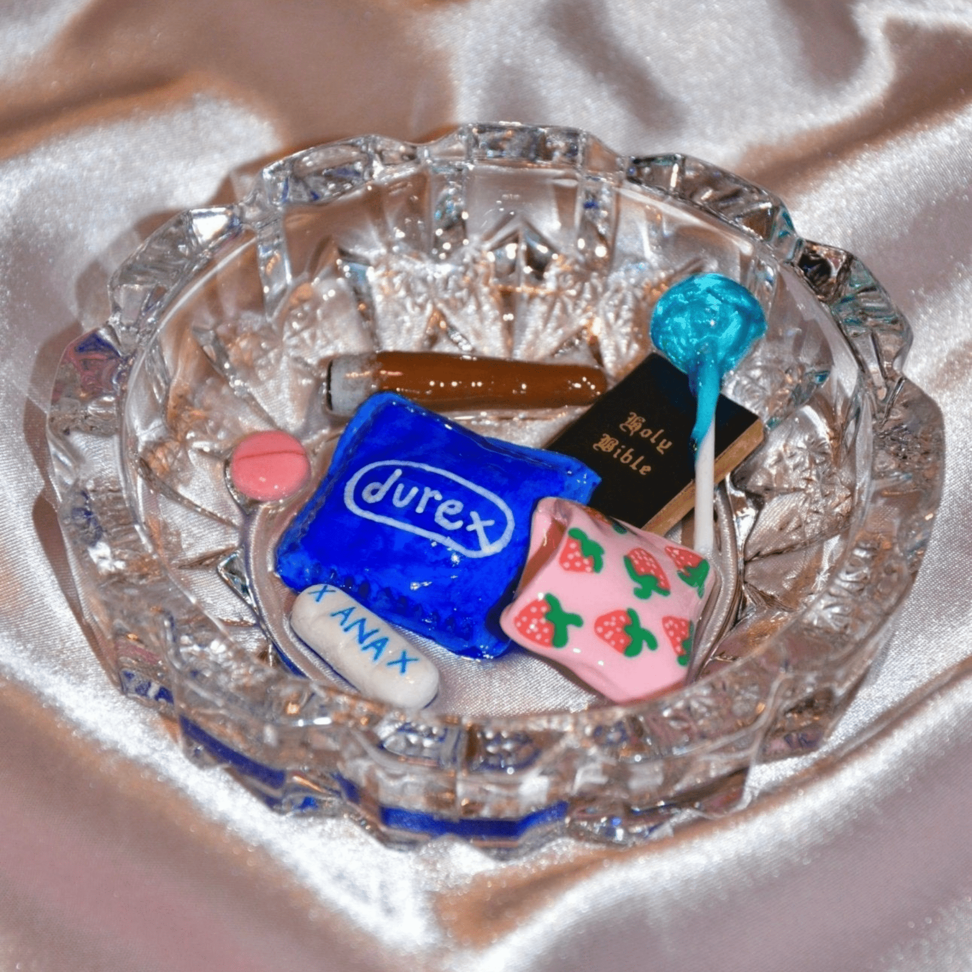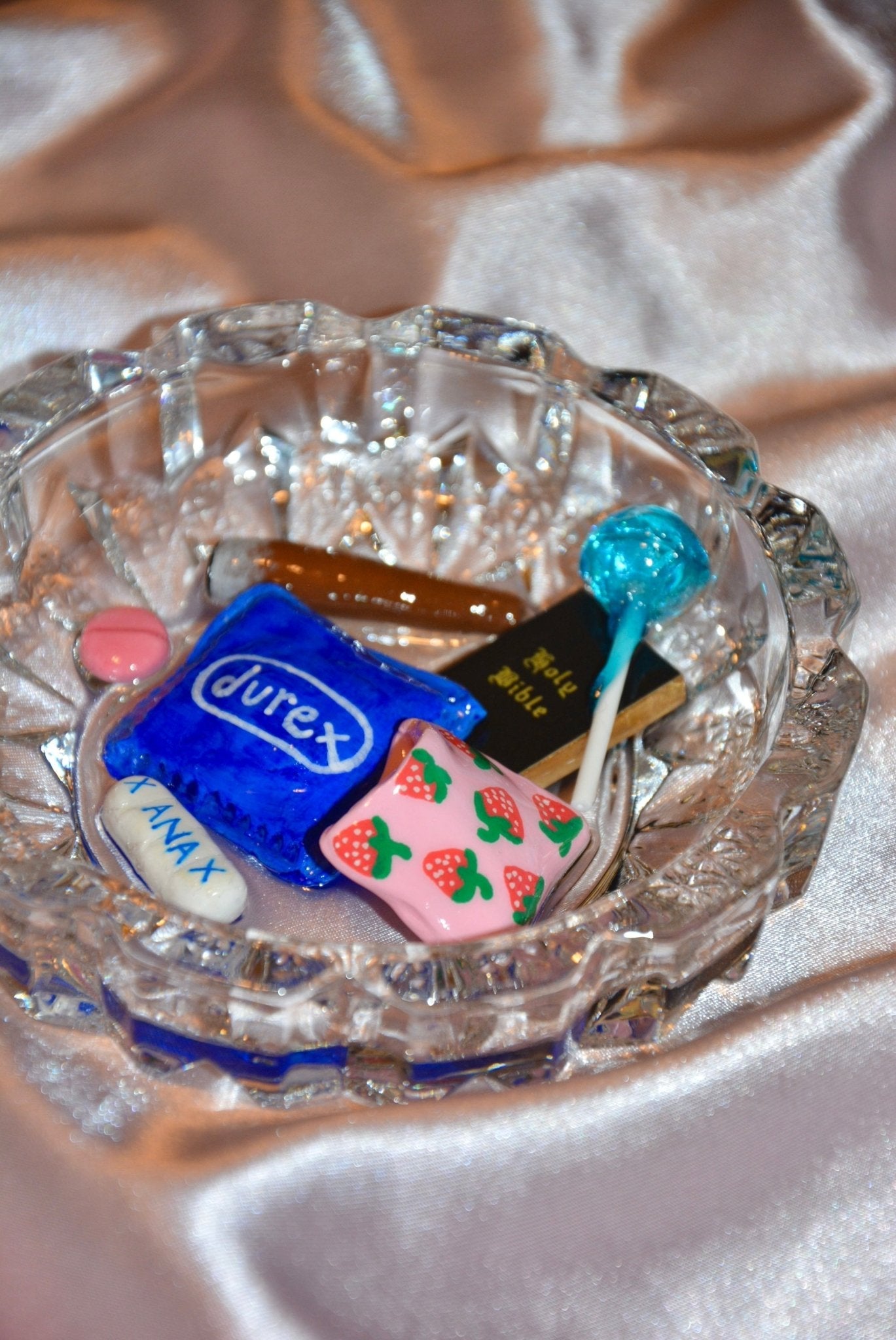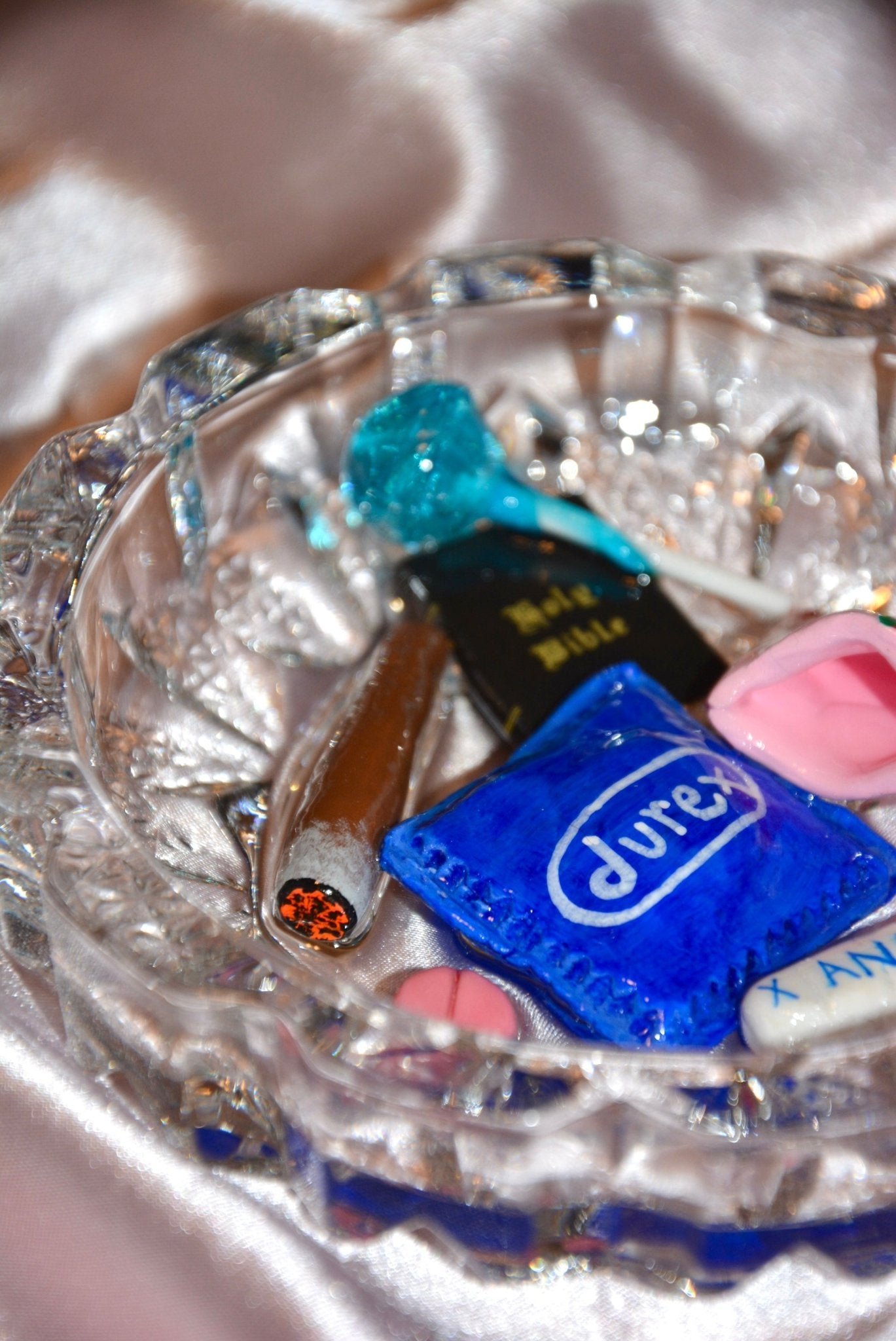 The ashtray playfully contrasts the sacred and the scandalous, challenging us to embrace our vices and celebrate the duality of human nature. Featuring a condom, pills, a bible and a joint, this ashtray is the ultimate conversation piece.