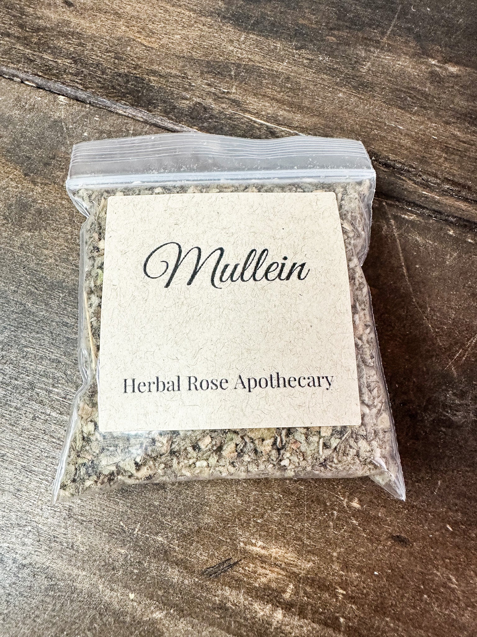 Mullein was once credited with magical virtues as well as medicinal actions. It's a valuable herb for congestion/cough and has been used previously for specific treatment for tracheitis and bronchitis. Generally the leaves and flowers are steeped in water to help reduce mucus formation and to help stimulate coughing up phlegm. Mullein is an expectorant and combines with other herbs like Thyme and Coltsfoot to help break up chest congestion.