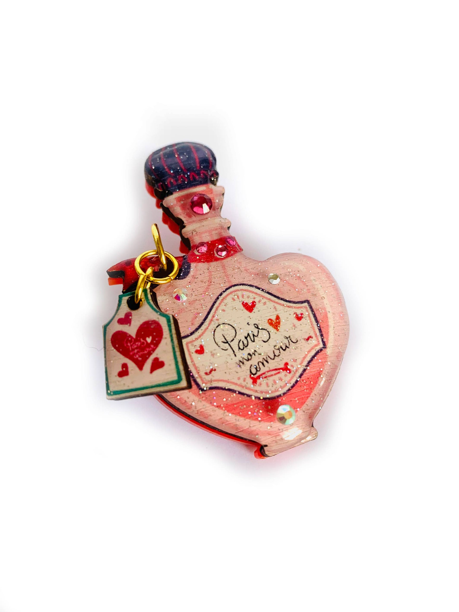 Jazz up your wardrobe with this stunning Paris Mon Amour Brooch by Rosie Rose Parker. Beautifully crafted from wood, resin, and glitter acrylics, this brooch features a charming perfume bottle illustration. Measuring 5cm x 6cm, it's the perfect accessory to add a quirky touch to any outfit.