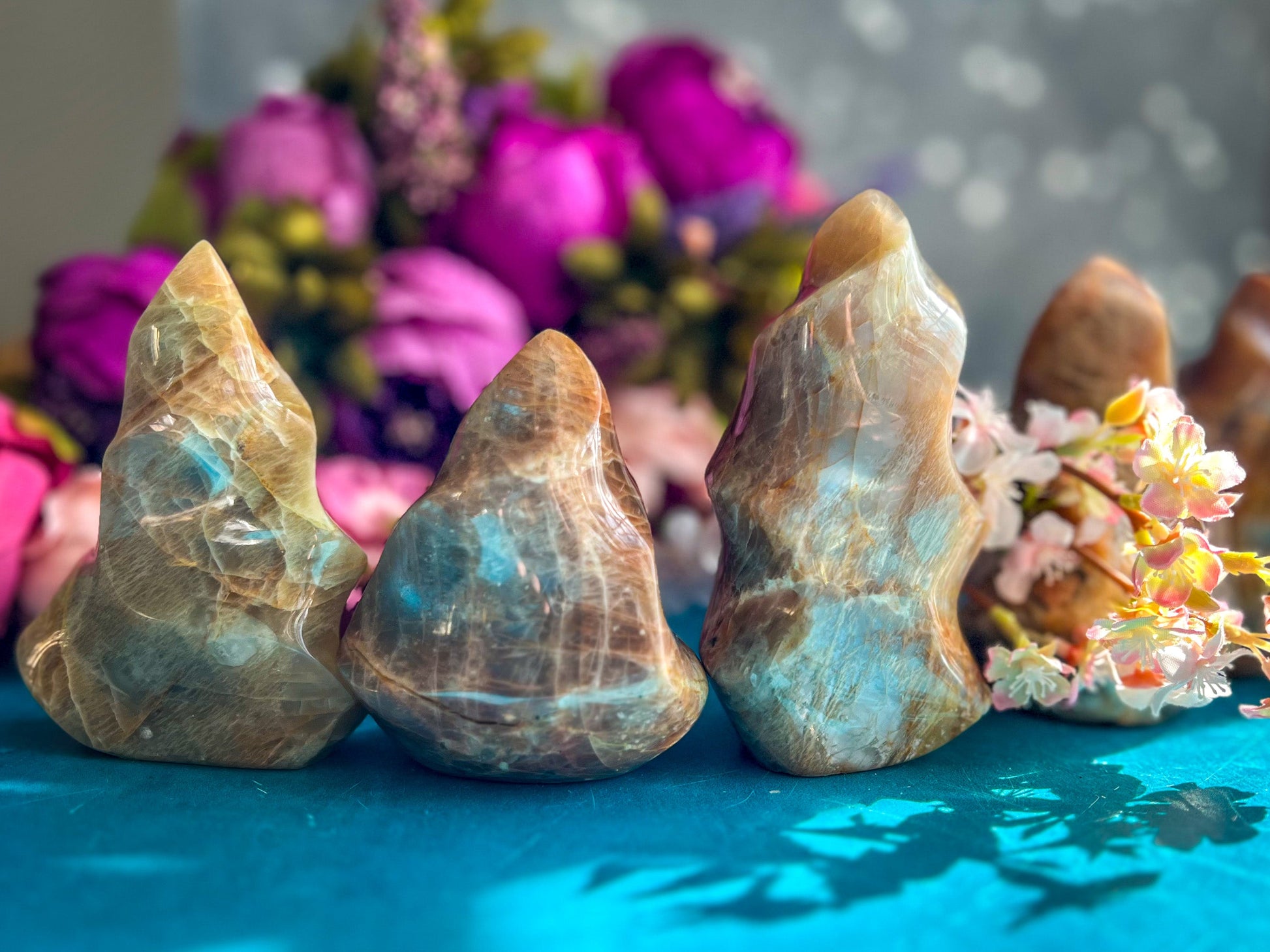 These peach moonstone flame have so much flash! Peach moonstone supports the 💜 as it stimulates the mind while soothing worry & bringing out the best in people. Its loving, supportive energy promotes the divine in all situations.