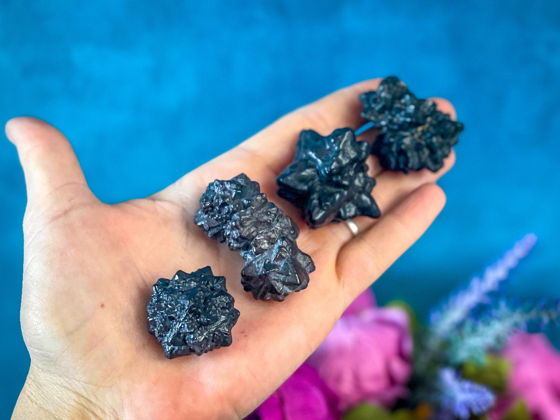 These crystals are a pseudomorph, Limonite / Hematite after Marcasite / Pyrite. The Limonite/Hematite has taken and morphed over the original crystalline structure of the Pyrite/Marcasite.