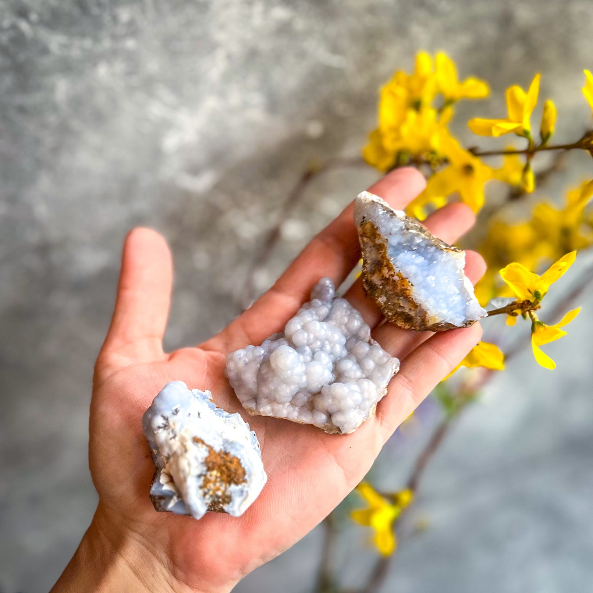 From botryoidal bubbly formations to druzy-covered surfaces that shimmer and sparkle with a celestial glow, our Blue Chalcedony specimens are as diverse as they are exquisite. Each piece tells a story of ancient geological processes and the delicate interplay of minerals that have converged to create these wondrous works of art.