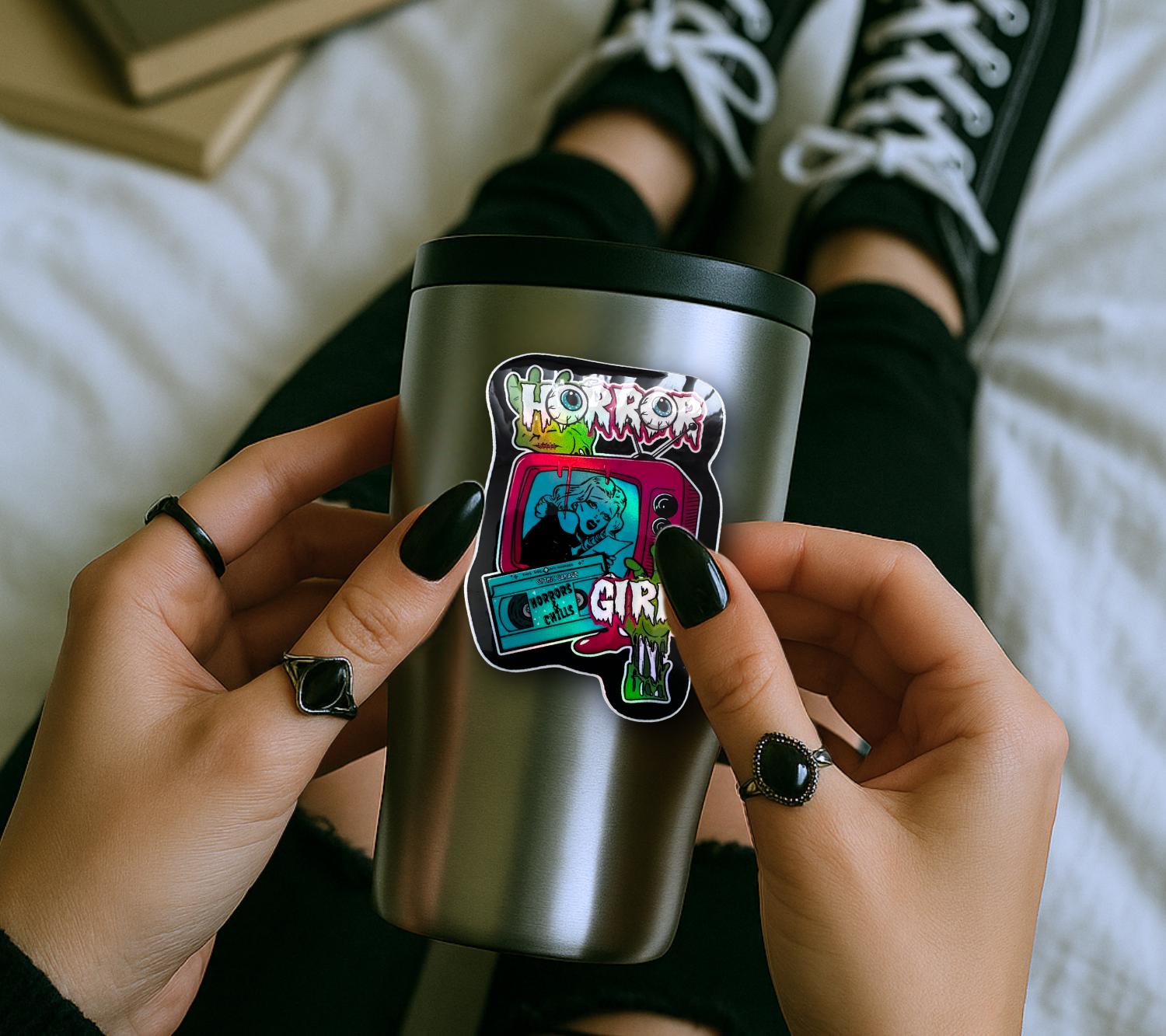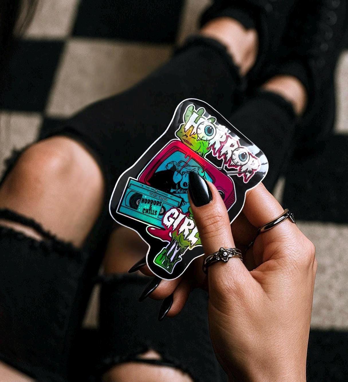Retro Horror Girl Waterproof Sticker – Vintage Gothic TV Design