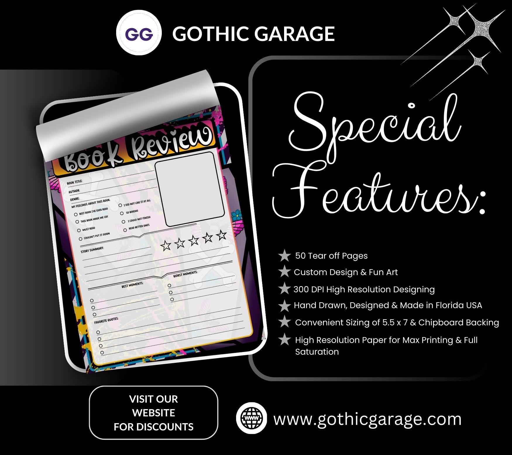 Perfect for dark academia fans, YA binge readers, horror lovers, and literary babes alike—this review notepad makes keeping track of your reads as fun as reading them.
